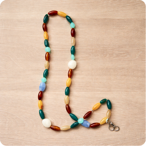 - Design technique : Un enchaînement harmonieux de perles polies aux formes organiques, inspiré par les couleurs de la terre et de l’eau.